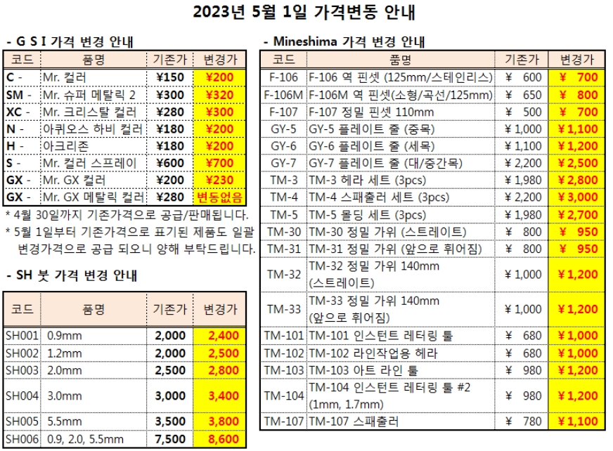 Mr.hobby 도료 가격인상.(구Gunze)